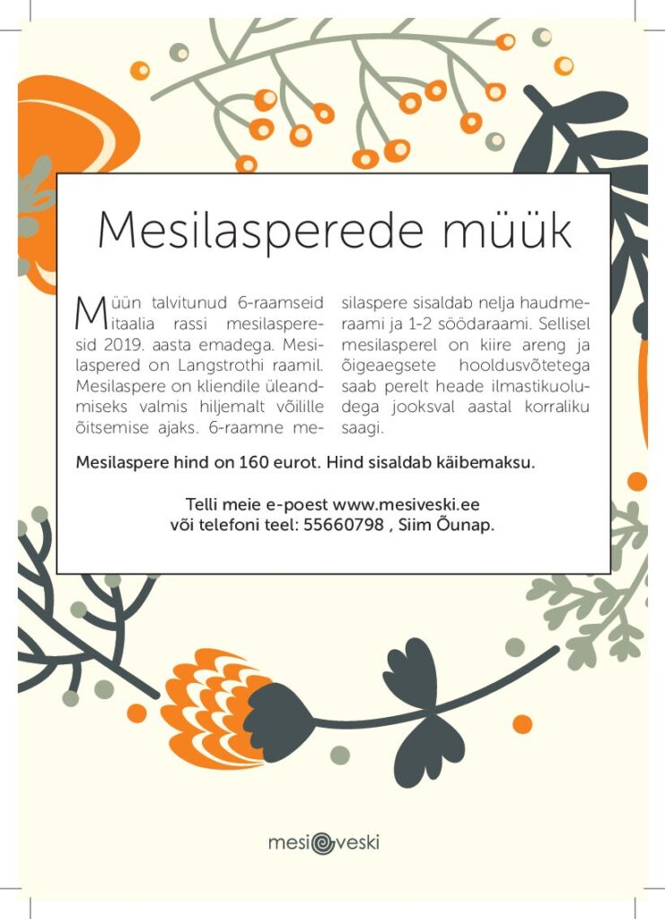 Alustame mesilaste talvesööda tellimuste vastuvõtmisega, mis kestab kuni 22. juunini. 1kg sööda maksumus on 1,09 eurot. Vedelsööt saabub juulikuu viimasel nädalal. Sööda saab kätte Põltsamaalt, Viljandi mnt.9 (tööpäevadel kella 10.00-17.00 […]